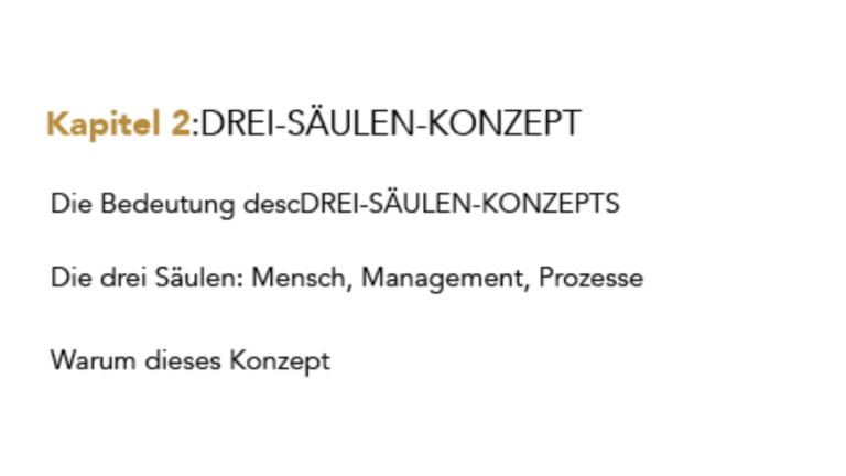 Das Drei-Säulen-Konzept verbindet die Elemente Mensch, Management und Prozesse zu einem ganzheitlichen Ansatz. Es hilft, eine Balance zwischen inneren Stärken und äußeren Strukturen zu schaffen, um nachhaltigen Erfolg und Wachstum zu fördern.